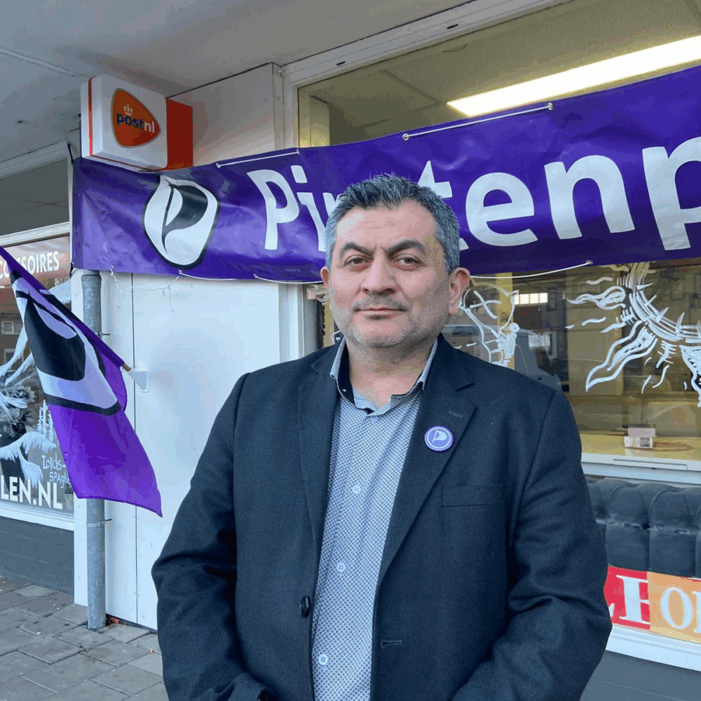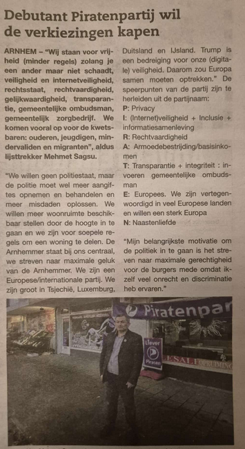 Posters van de Piratenpartij zijn gratis op te halen bij Mehmet Sagsu’s winkel Meram Meubelen aan de Pijlkruidstraat 12 in Arnhem. Postcode 6832JB.
